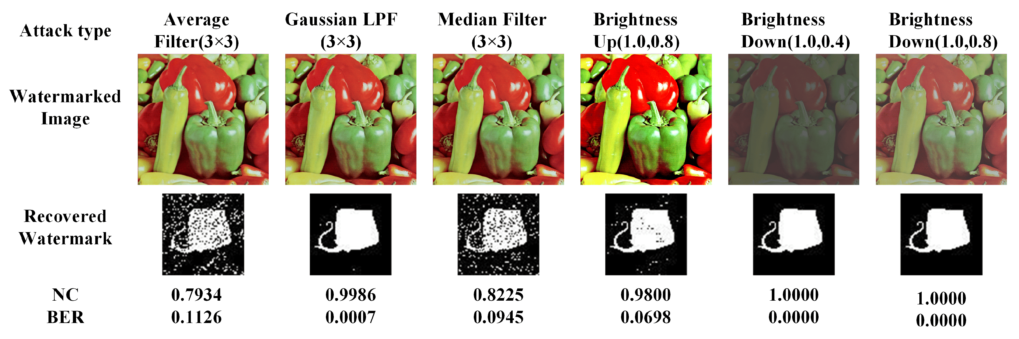 In this simulation, the image with a watermark is attacked by a variety of filters, such as the median filter, averaging filter, and Gaussian Low Pass Filter (LPF), and the variations of the attacks on the luminance include increasing the luminance and decreasing the luminance.