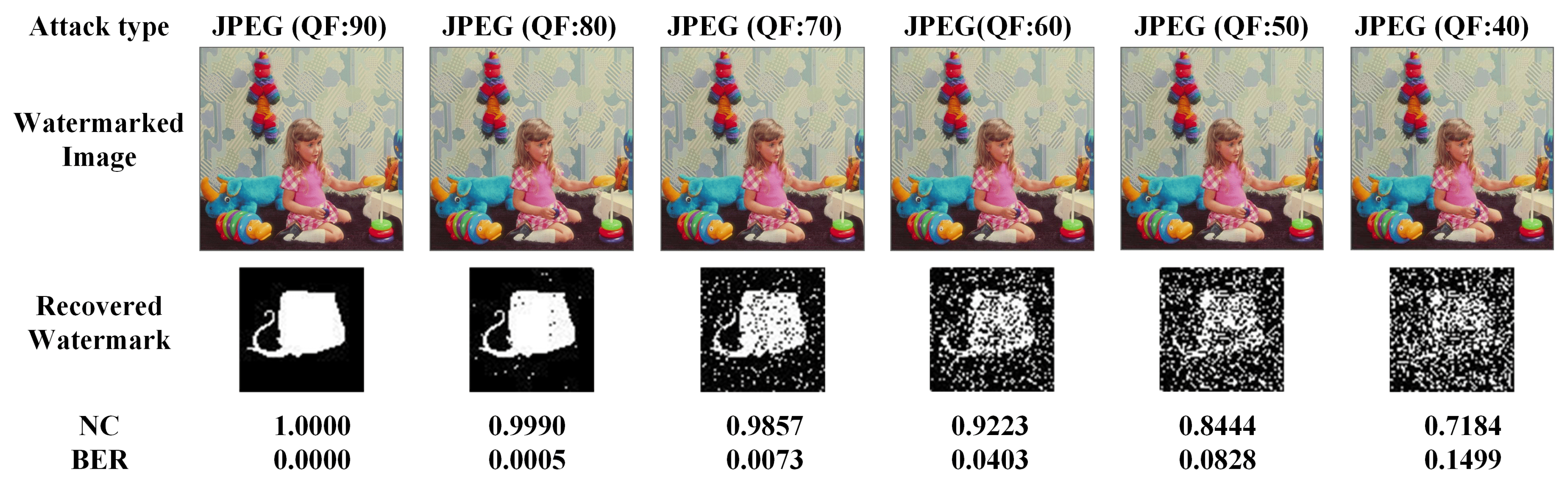 Table 5 that when the QF is varied between 60 and 90, the NC is close to or in the same range as 1. This indicates that the recovery of the watermarked pictures is almost the same or exactly the same as that of the source watermarked pictures. It is also seen that as the QF is placed at 40 or 50, the NC levels of some of the watermarked pictures depart by 1 and 0, and the deviation increases as the QF is set lower, but the NC value remains above 0.64 at a QF of 40 for JPEG, indicating that the present method has a certain degree of resistance to JPEG compression.