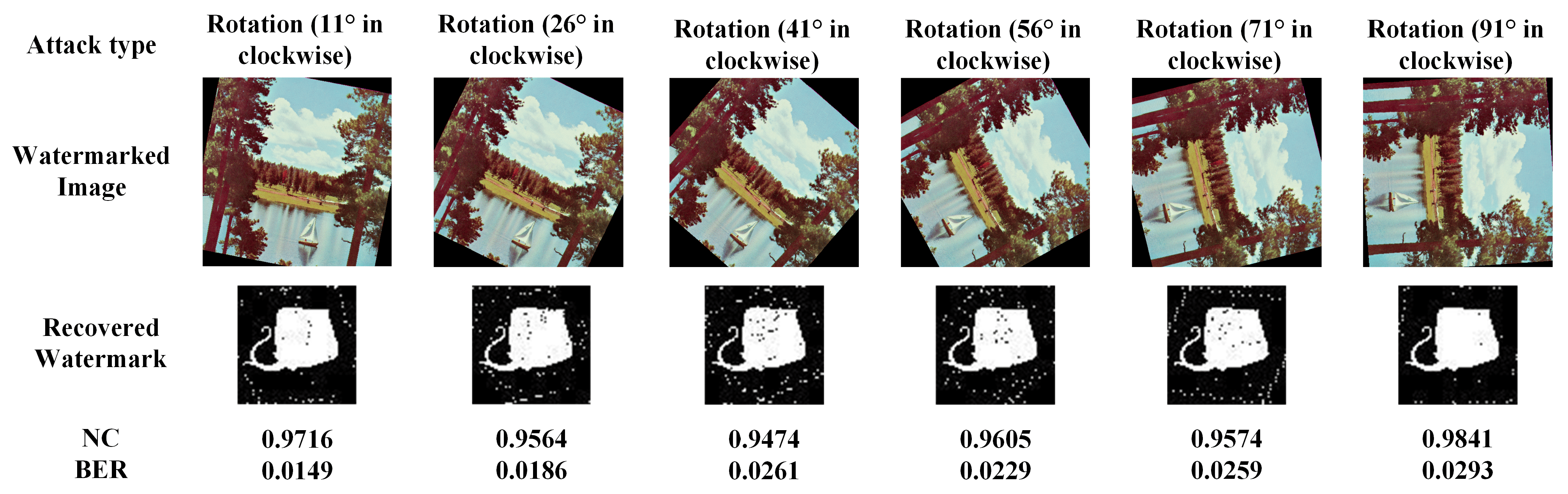 In this experiment, the watermarked image rotation attack was used. In this experiment, the attack with clockwise rotation of the watermarked image is taken; the rotation angles are 11°, 26°, 41°, 56°, 71°, and 91°. The NC values are listed in