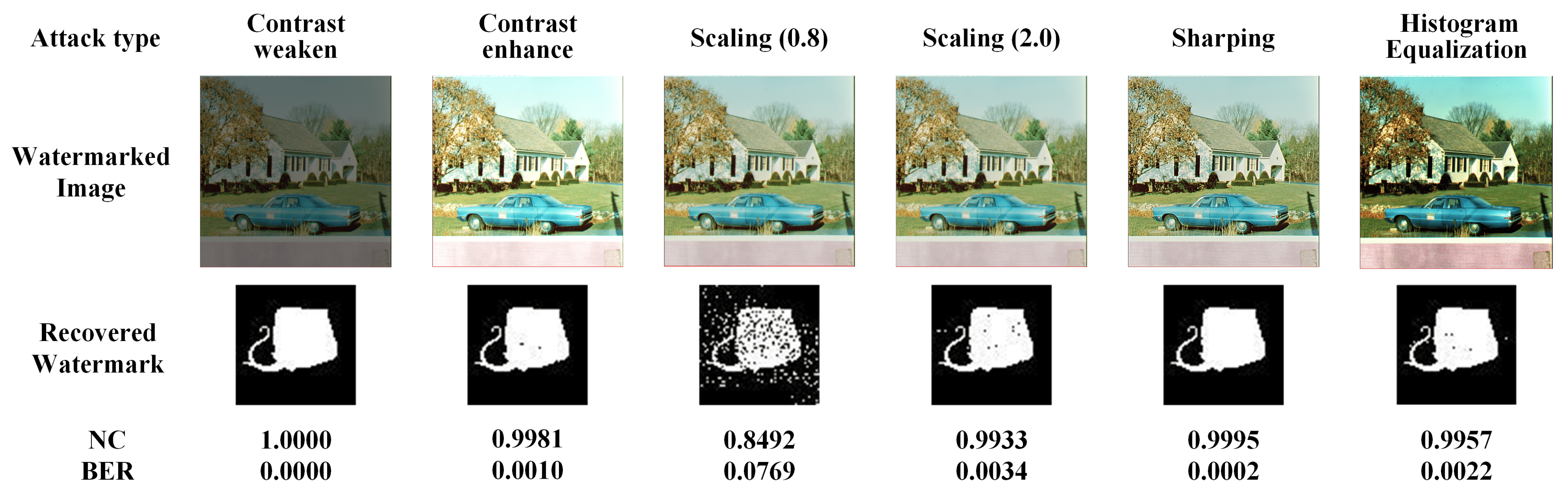 In this experiment, the watermarked image is subjected to contrast attack, scaling attack, sharpening attack, and histogram equalization attack. The contrast attack takes both contrast enhancement (value 1.2) and contrast reduction (value 0.8), the scaling attack uses 0.8 times and 2.0 times to attack the image, and the sharpening attack value uses 2.