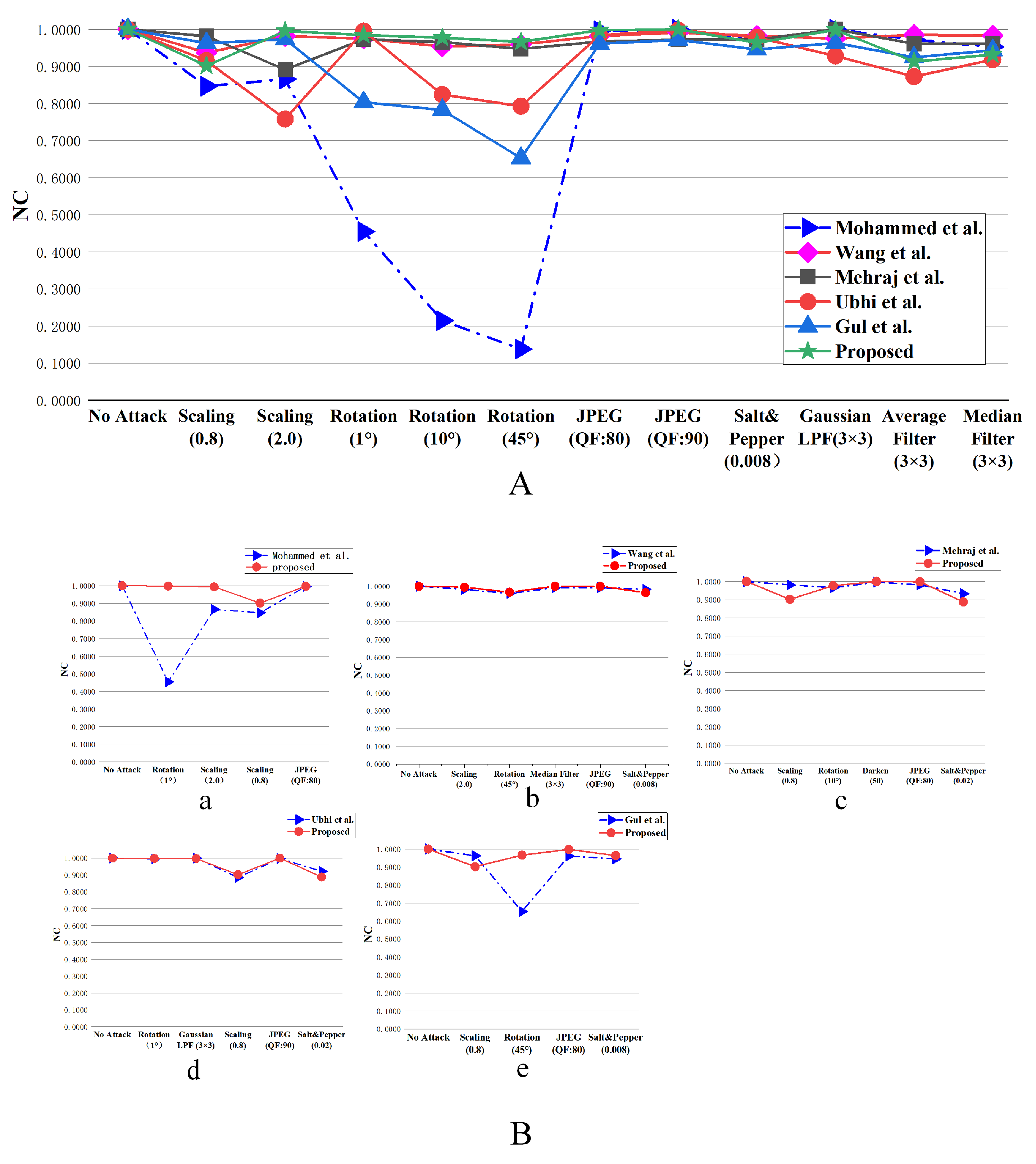 13]. Moreover, under JPEG compression attack, our method is slightly better than the methods of Mohammed et al. [