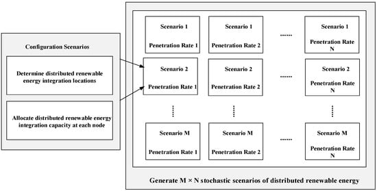 The generation of stochastic scenarios for distributed renewable energy integration primarily involves two key elements: the locations and capacities of integration. In this section, various configuration scenarios are constructed by randomly assigning integration locations and capacities for distributed renewable energy resources, as illustrated in Figure 1. This methodology is particularly appropriate for distribution networks with complex grid structures, in which it is difficult to intuitively identify the most critical points for renewable energy integration. Furthermore, to analyze the principal limiting factors of hosting capacity at different levels of distributed renewable energy penetration, an initial penetration rate is established and systematically increased according to a predetermined step size. This process yields a series of configuration scenarios corresponding to various penetration levels, thereby facilitating a comprehensive analysis of hosting capacity constraints across different scenarios.