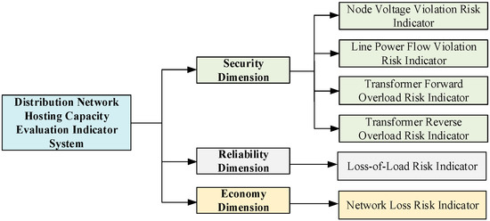 Owing to weak voltage support at the end of distribution network feeders, scenarios in which significant amounts of distributed renewable energy are concentrated at the feeder extremities are especially susceptible to node voltage limit violations and reverse power flow. To prevent these phenomena from unduly influencing final hosting capacity assessment outcomes, Reference [16] calculated overvoltage risk indicators at various photovoltaic penetration levels and determined the photovoltaic hosting capacity of the distribution network by setting an acceptable risk threshold. Reference [17] addressed overvoltage issues associated with large-scale distributed photovoltaic integration by introducing probabilistic voltage violation risks, thereby quantifying the overvoltage risk resulting from operational uncertainty in distributed photovoltaics. Reference [18] examined the reliability of distribution networks equipped with distributed generation, analyzing voltage enhancement, optimization, and the minimization of voltage deviation. While these studies primarily focus on overvoltage risks during network operation, practical operation is subject to a range of risks—including voltage limit violations, power flow overloads, transformer reverse overloads, and power supply reliability issues—all stemming from uncertainties in source-load power and distributed renewable energy configuration methods. Consequently, there is an urgent need to develop a comprehensive and scientifically grounded evaluation index system for distribution network hosting capacity.