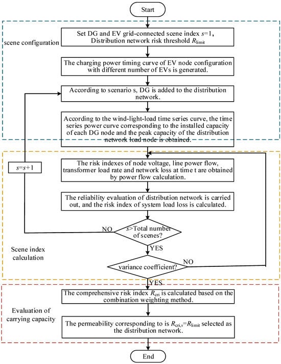 When evaluating the new energy hosting capacity of distribution network, the random simulation of various DG configuration modes is realized by random scene analysis method, so as to avoid the limitation of single scene analysis. Based on the two-stage clustering method, the typical time series curve of wind–solar-load is generated to avoid the one-sidedness of the static peak hypothesis of node output and load level in the traditional method. A multi-dimensional risk index considering voltage over-limit, line overload, transformer heavy overload, network loss and load loss risk is constructed to achieve a comprehensive assessment of safety, reliability and economy. Distribution network operators can set risk thresholds according to the operation safety of distribution network, the regulation ability of electrical indexes such as voltage and power flow, and the planning demand of distributed new energy, and bear a certain possibility of exceeding the limit in exchange for more capacity of distributed new energy grid connection. The above-mentioned evaluation method process of distribution network hosting capacity considering the uncertainty of power on both sides of source and load and the uncertainty of distributed new energy configuration mode is shown in Figure 4.