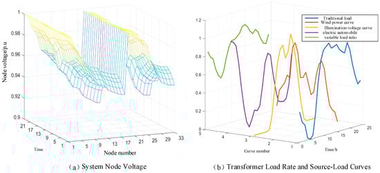 At a penetration rate of 20%, nodes 3, 14, 18, 21, and 26 are selected for photovoltaic integration, while nodes 23 and 33 are chosen for wind power integration. Typical day 4 serves as the source-load power curve representing the distribution network operation scenario. The node voltage distribution for this scenario is shown in Figure 6a, illustrating that voltages at the end nodes drop below the permissible lower threshold.