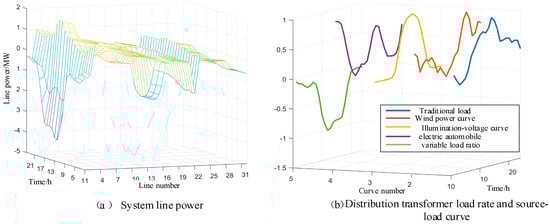At a penetration rate of 180%, nodes 3, 21, and 23 are selected for photovoltaic and wind power installation, with typical day 5 serving as the source-load output curve for distribution network operation scenario M3. The line power and distribution transformer load rates for this scenario are depicted in Figure 7. As shown by the line power distribution in Figure 7a, when distributed generation units are concentrated near transformer nodes, the line’s power-hosting capacity is insufficient to accommodate the reverse power flow induced by high penetration levels of distributed generation, resulting in line power exceeding the rated capacity. The calculated branch power violation risk and transformer reverse overload risk for this scenario are 1.634 × 10−6 and 3.049 × 10−5, respectively.
