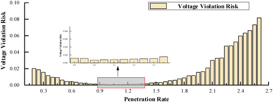 As shown in Figure 8, when the penetration rate reaches 100%, the voltage violation risk in the distribution network decreases to its minimum value of 6.892 × 10−4. However, within the penetration range of 100% to 130%, the risk of voltage violation gradually increases as the integration capacity of distributed generation (DG) rises, reaching a value of 9.565 × 10−4 at 130% penetration.