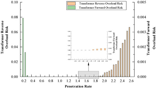 The trends in transformer forward and reverse overload risks are depicted in Figure 9. In the initial penetration phase (20–30%), forward overload is the predominant risk. During the mid-term penetration phase (35–145%), there is no observable overload risk. In the high penetration phase (150–260%), reverse overload risk emerges as the primary concern.