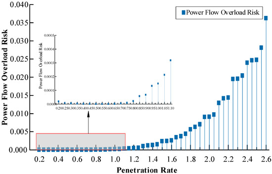 Within the 25–75% penetration range, distribution network power flow overload risk remains below 2.541 × 10−6 and is primarily attributable to extreme scenarios featuring highly concentrated DG configurations. Since practical distribution network planning generally employs dispersed DG integration, such extreme concentration scenarios are rare, and thus the power flow overload risk in this range is negligible. As DG penetration increases, the power flow overload risk shows gradual growth during the 75–145% penetration phase, offering network operators an adjustable window to manage overload risks. However, at penetration rates of 150% and higher, the line power flow violation risk escalates exponentially, subjecting the distribution network to unacceptably high levels of power flow violation risk.