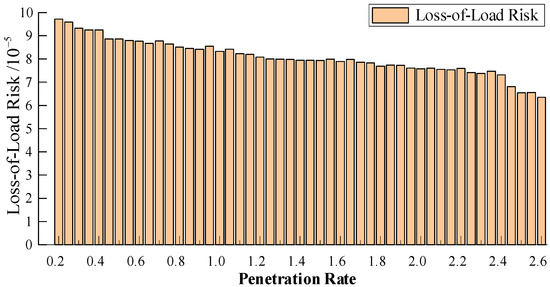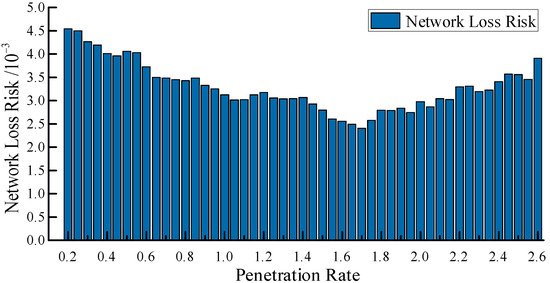 As shown in Figure 11, the risk of load loss gradually decreases with the increase of DG permeability. In the low penetration stage, the access of DG helps to form an island power supply after the line fault, but the limited island operation capacity leads to the inability of some loads to supply power. The island operation ability in the high permeability stage is improved, which can effectively reduce the risk of system load loss.
