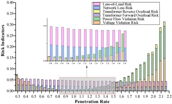 As illustrated in Figure 13, the security risk of the distribution system reaches its lowest value at a penetration rate of 100%. When considering only security risks, the optimal hosting capacity for distribution network operators is 3.715 MW. However, when incorporating a comprehensive set of factors—including security, network loss (economy), and power supply reliability—the minimum comprehensive system risk is observed at a penetration rate of 105%, with a value of 5.159 × 10−2. Accordingly, the optimal hosting capacity considering all risk dimensions is 3.9 MW. Meanwhile, within the penetration range of 110% to 145%, security risks exhibit a gradual upward trend, while reliability and economic risks demonstrate a downward tendency. No reverse overload risk has been detected in transformers during this phase. For this penetration interval, distribution system operators (DSOs) may establish risk thresholds based on the voltage and power flow regulation capabilities of adjustable resources within the system, thereby assessing the maximum hosting capacity under acceptable risk levels. Under the constraint of a comprehensive risk threshold of 6.592 × 10−2, the upper limit of DG penetration rate is identified as 140%, with a corresponding DG integration capacity of 5.201 MW, and exceeding this critical value triggers a nonlinear increase in voltage violation risk, transformer reverse overload risk, and line overload risk, consequently rendering the comprehensive risk of the distribution network excessive.
