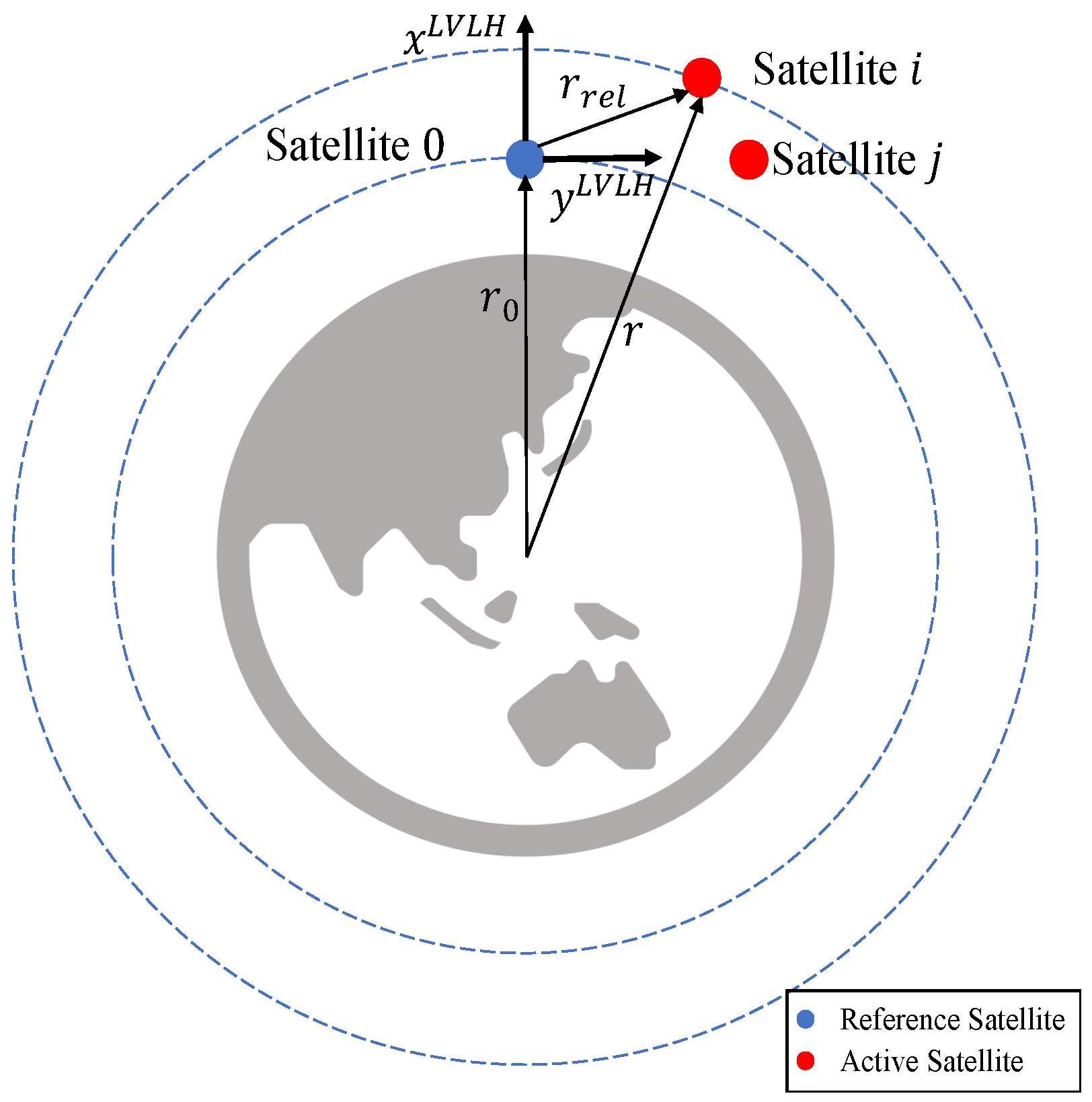 The relative position of the reference satellite and active satellites are depicted in