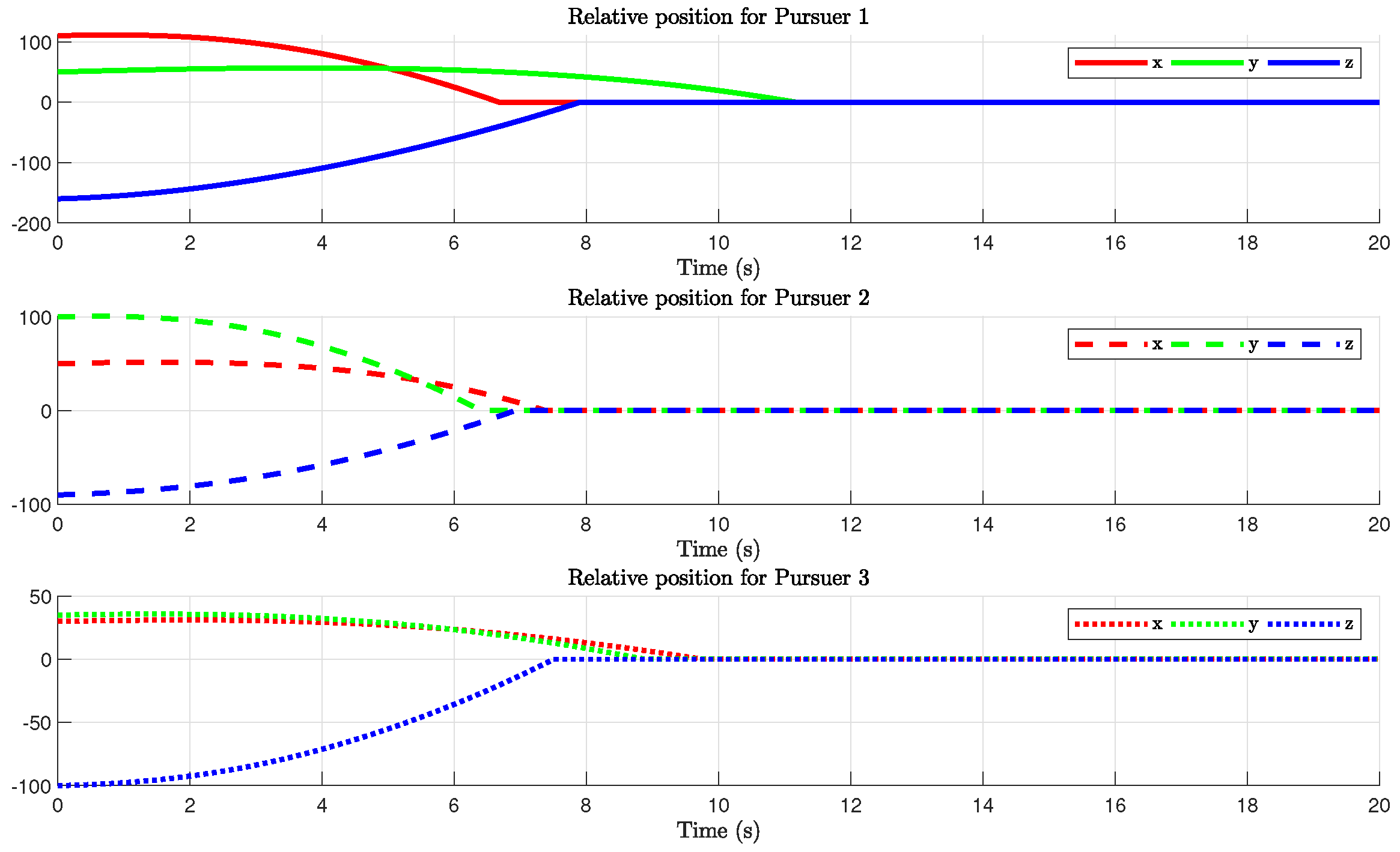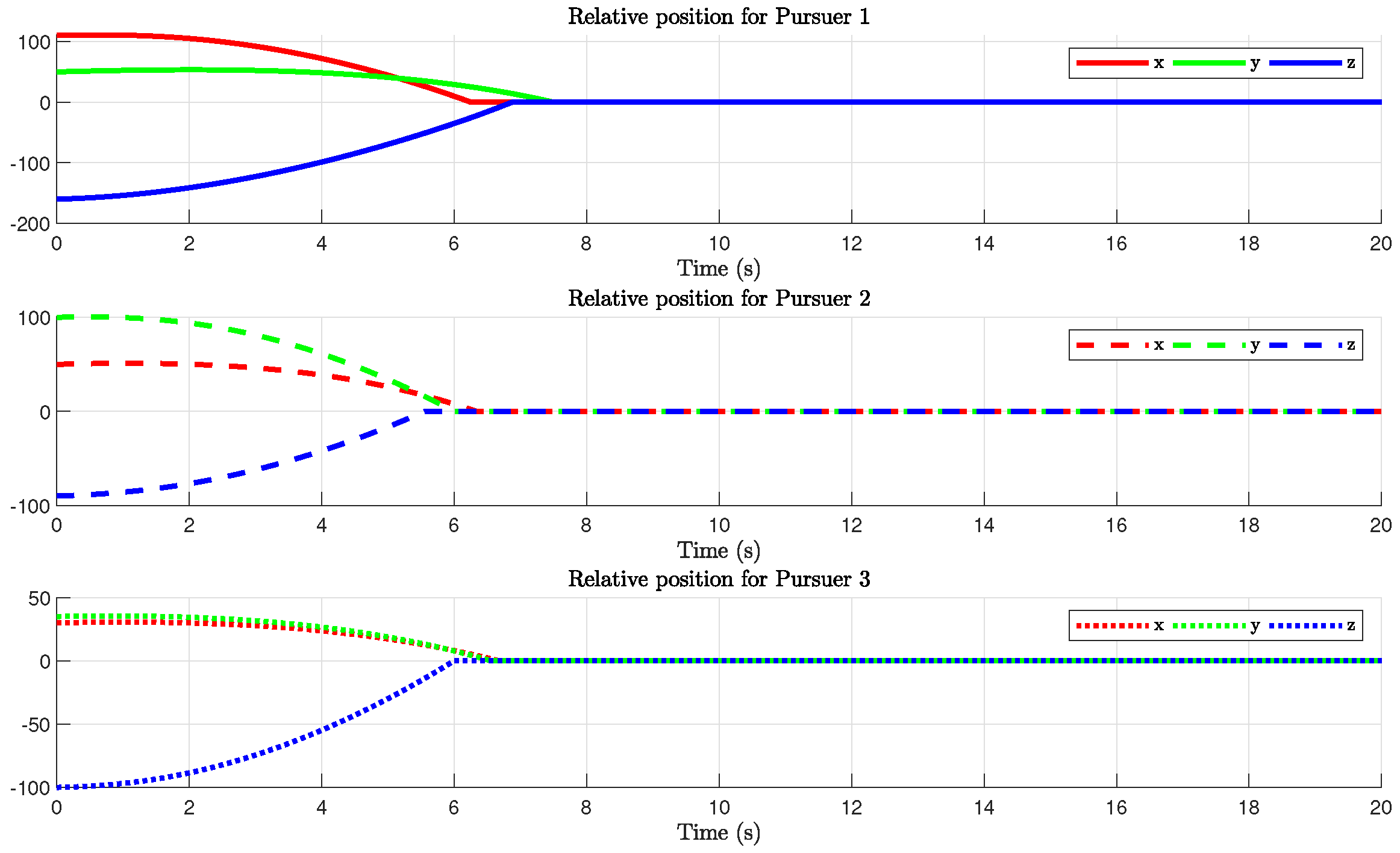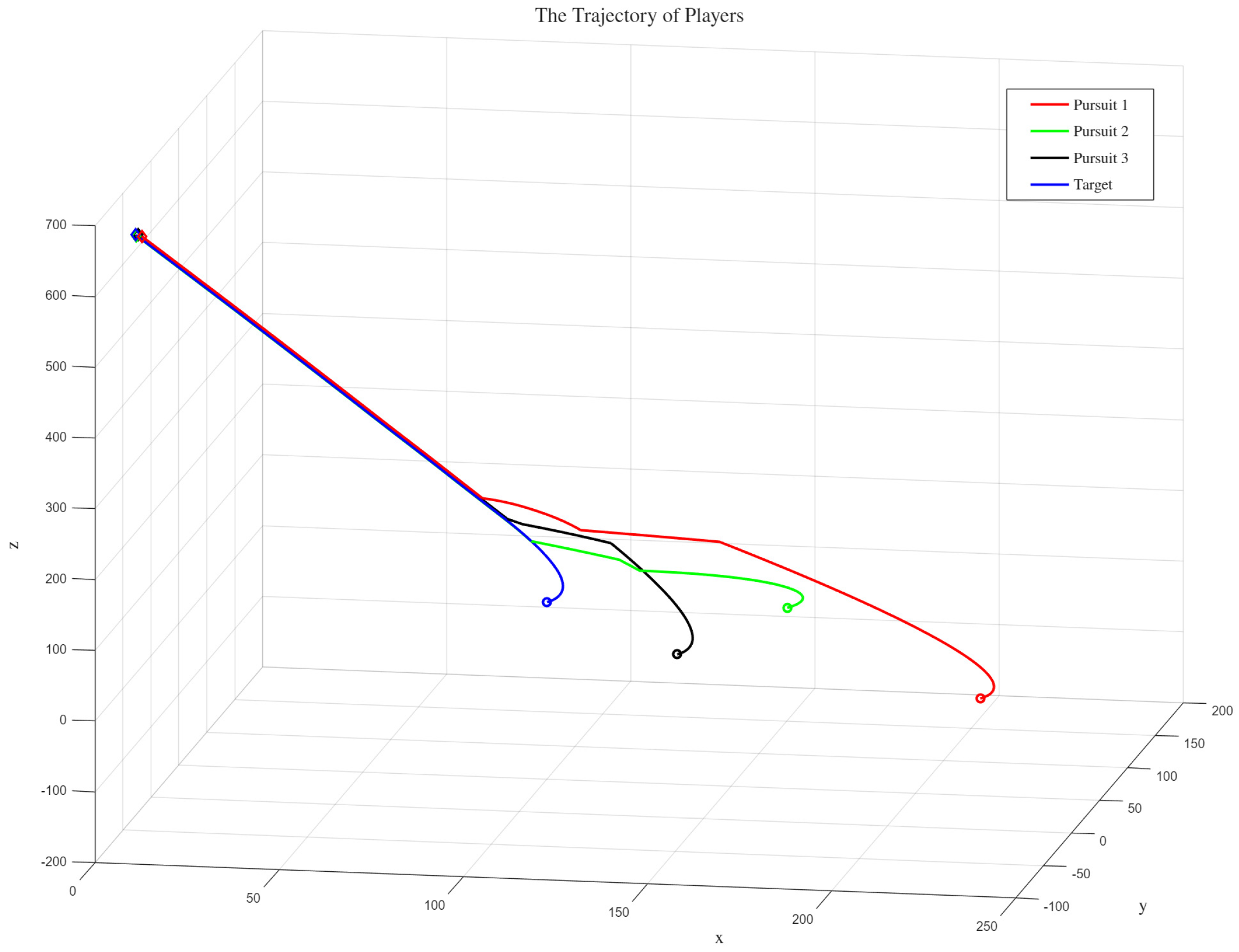 Figure 6 illustrates that Pursuer 2 achieves tracking of the target earliest, followed by Pursuer 3, and finally Pursuer 1 intercepts the target at