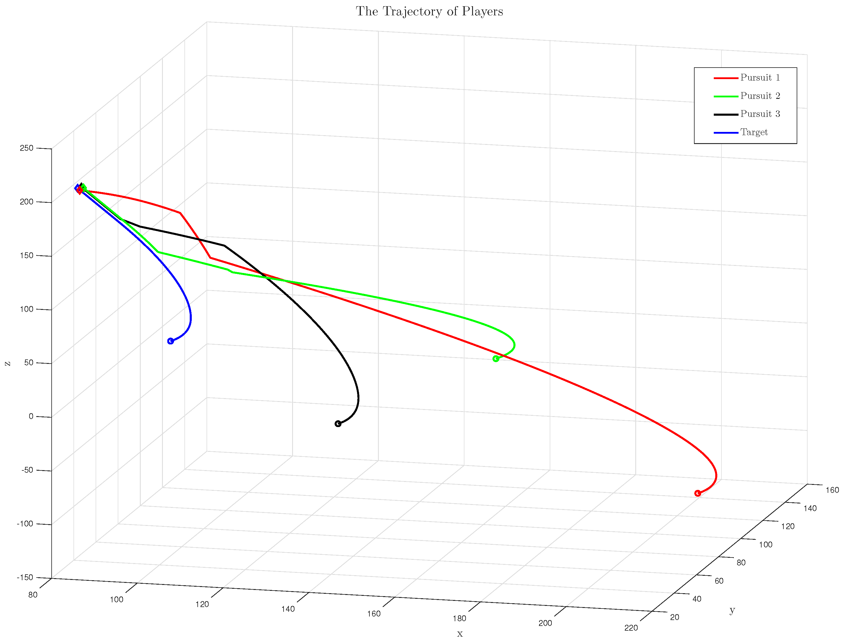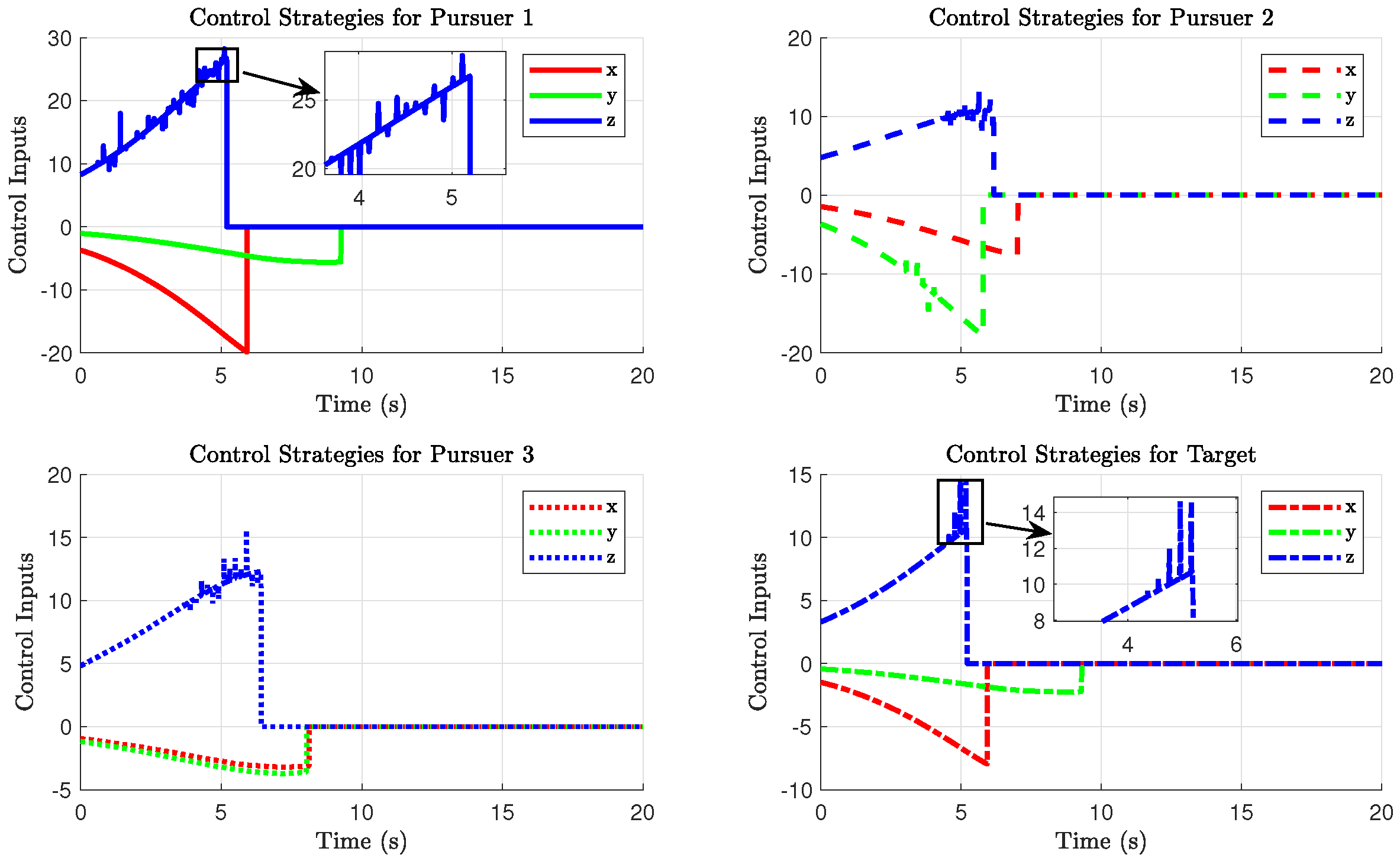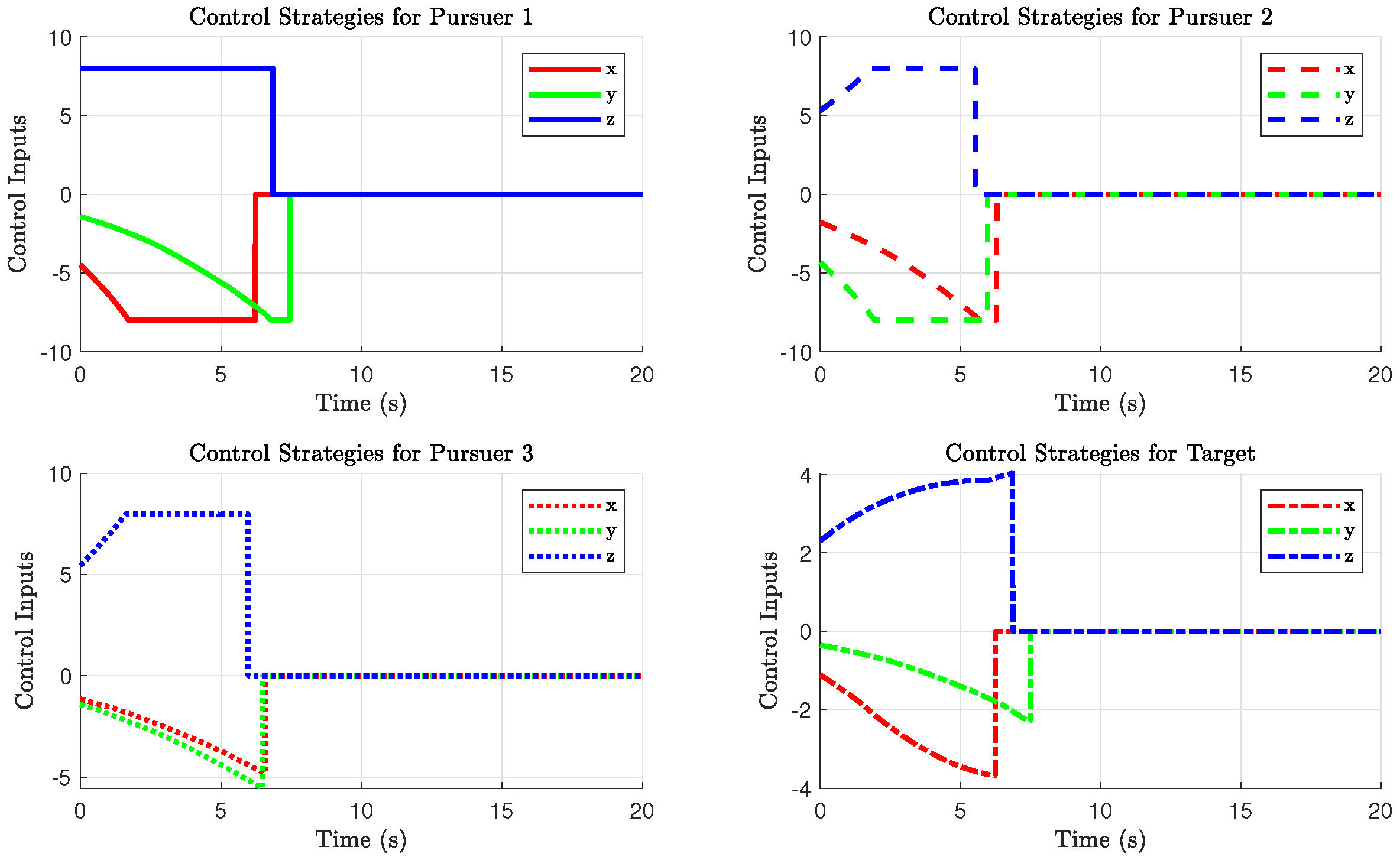 Figure 6 illustrates that Pursuer 2 achieves tracking of the target earliest, followed by Pursuer 3, and finally Pursuer 1 intercepts the target at