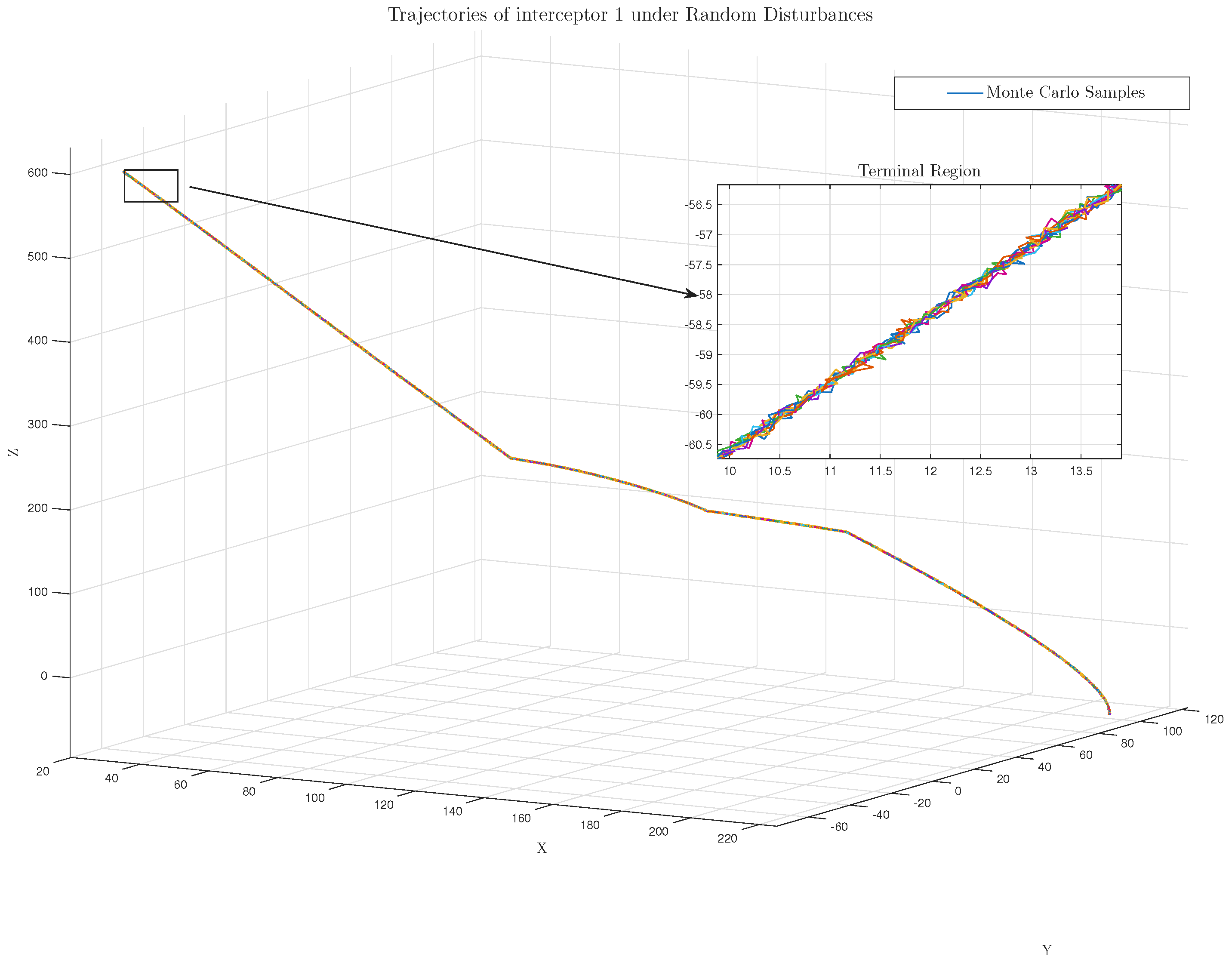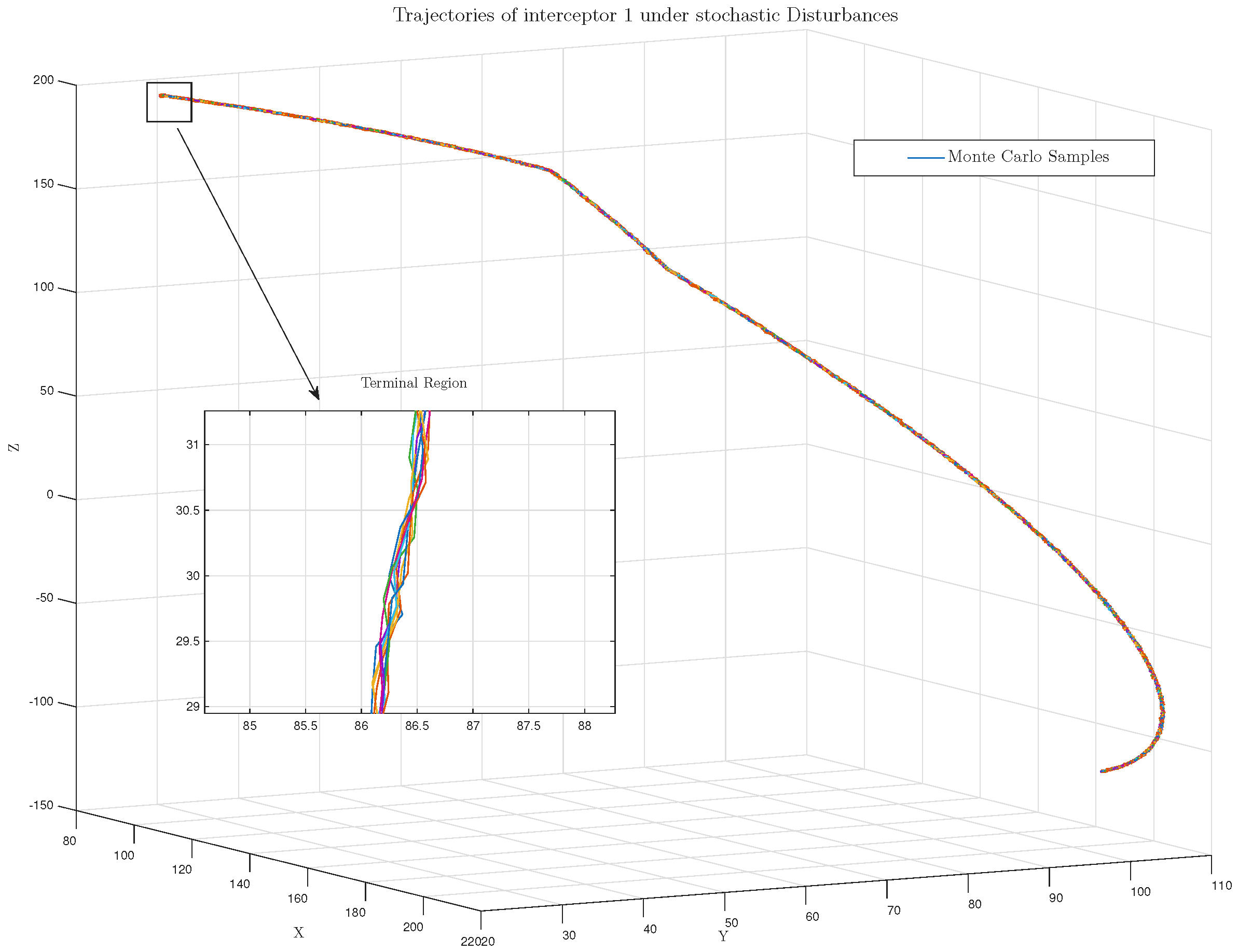 Figure 9 show the three-dimensional trajectories of Pursuer 1 under ten independent realizations of stochastic noise. Despite the stochastic perturbations, all trajectories converge to the target within a narrow region around the nominal interception point. The right-hand inset in