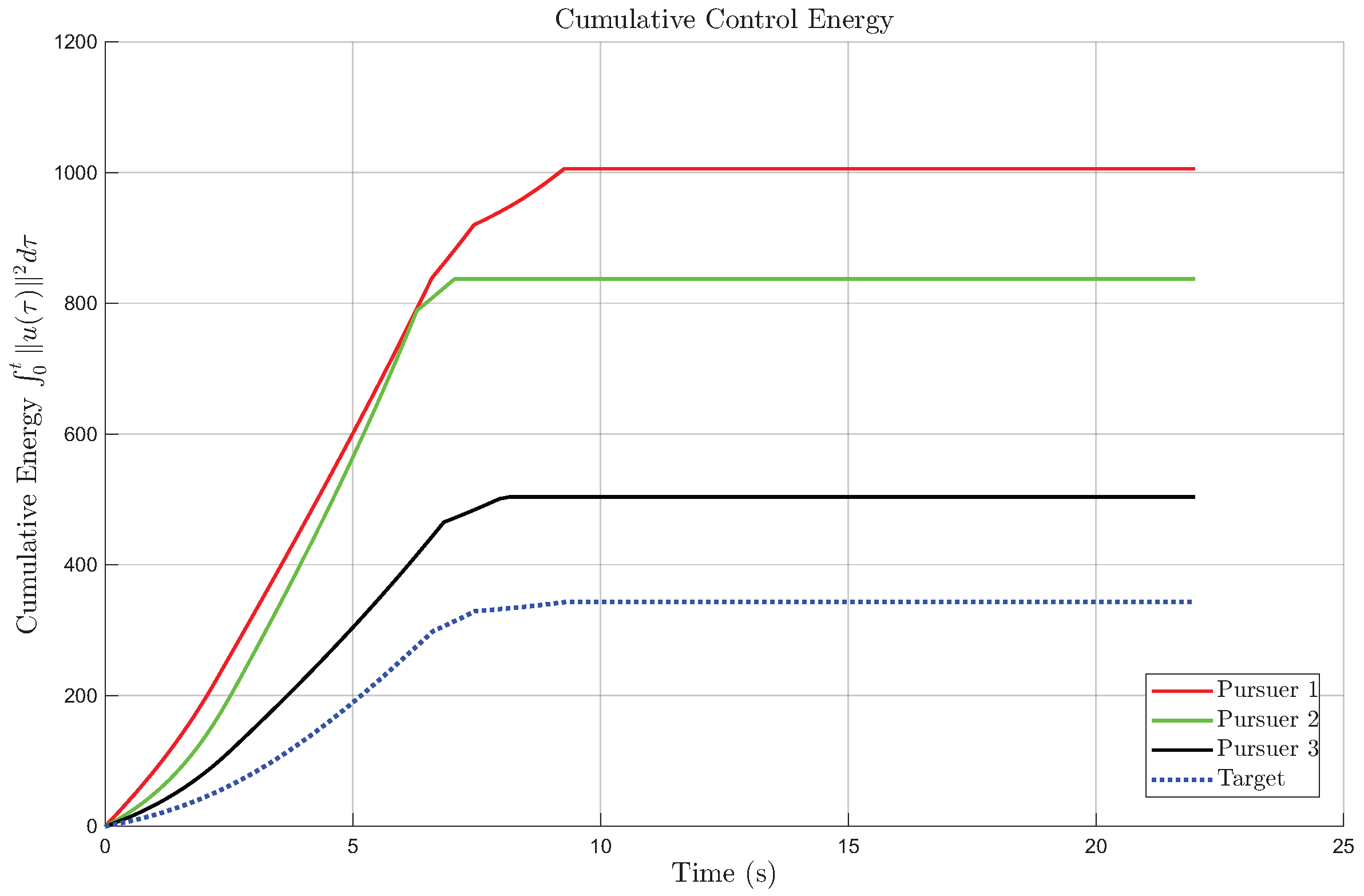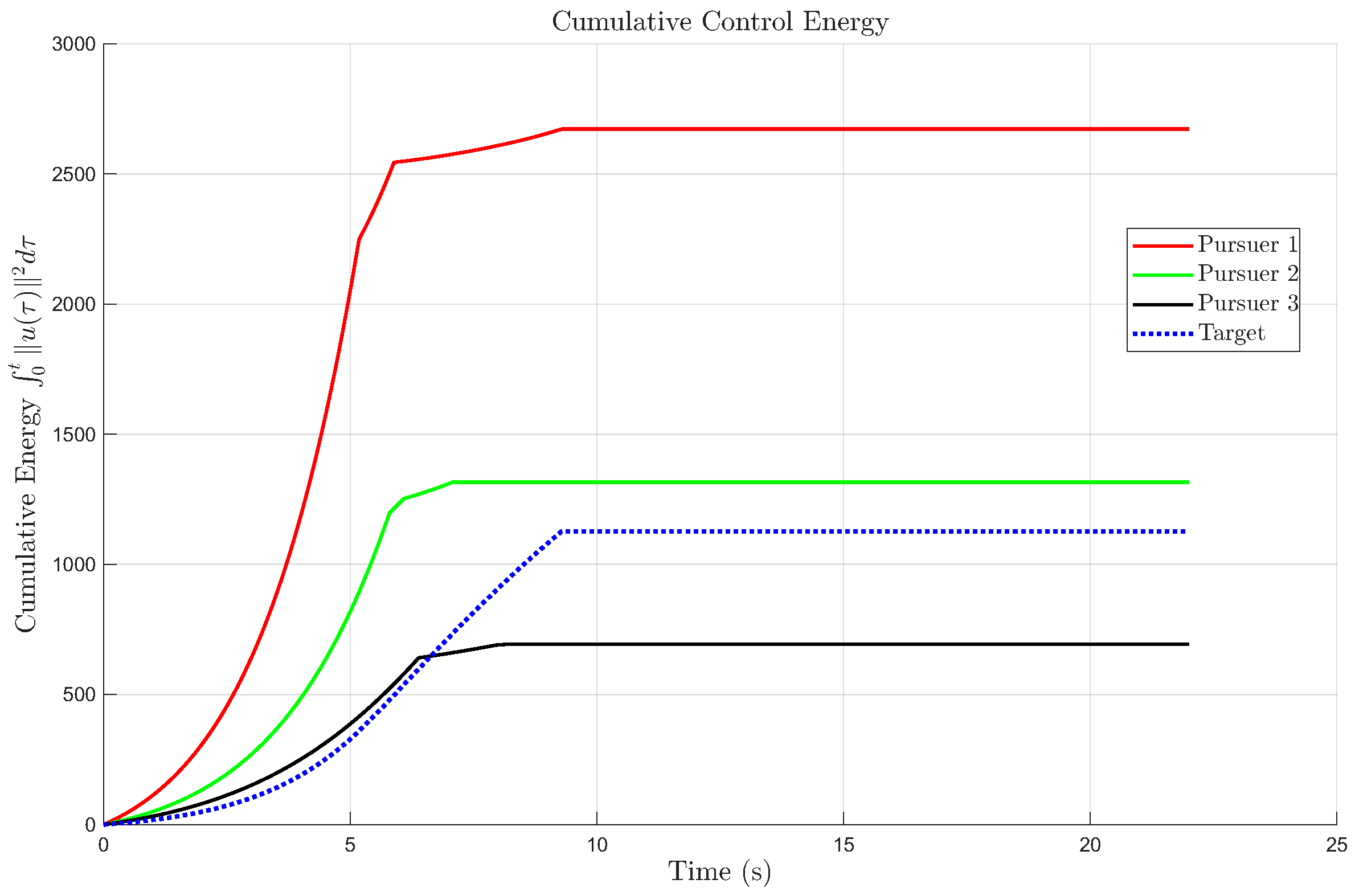 Figure 11. The cumulative energy curves reveal that the three pursuers exhibit similar energy profiles, with smooth control responses and no excessive oscillations. The cumulative energy comparison further demonstrates that the cooperative control strategy achieves successful interception with balanced and efficient control effort. Overall, the above results demonstrate that the proposed control law is robust, energy-efficient, and tolerant to both stochastic disturbances and actuator saturation. The inclusion of the magnified trajectory view and time-varying energy curves provides strong quantitative and visual evidence supporting the controller’s reliability and practical feasibility.