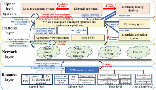 Based on the principle of layered design, the architecture of a VPP typically comprises four layers from bottom to top: the resource layer, network layer, platform layer, and upper-level systems. This integrated architecture achieves unified operations for resource aggregation, coordinated control, market transactions, and grid dispatch through top-down command flows and bottom-up data flows. The schematic diagram of the architecture is shown in Figure 1 [14].