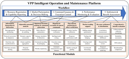 As shown in Figure 1, the most critical component within a VPP is its intelligent operation and maintenance platform. Serving as the central hub for information and command exchange, this platform functions as the brain of the VPP. The detailed functional architecture of the VPP intelligent operation and maintenance platform is illustrated in Figure 2 [15].