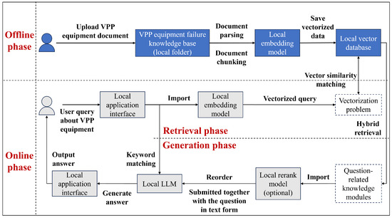 When establishing a root cause query model for equipment failures on the VPP intelligent operation and maintenance platform, the process is divided into offline and online phases: During the offline phase, we upload the compiled equipment failure-related materials to the web server. The server stores these materials in a data repository for subsequent management of additions and deletions. Subsequently, the locally embedded model parses and chunks the uploaded data, generating semantically coherent text fragments. These fragments undergo vectorization, transforming them into vector representations in high-dimensional space, and are ultimately stored in a vector database. This process aims to transform unstructured raw documents into a structured knowledge base that can be efficiently retrieved. During the online phase, after the user poses a question, the server initiates the retrieval and generation process. In the retrieval phase, the question is first received by the web server, which simultaneously performs keyword matching and vector similarity matching. The latter involves the server converting the user’s query information into vectors via the local embedding model, then matching these vectors against a vector database to match the most semantically relevant knowledge fragments. During the generation phase, knowledge chunks relevant to the question are extracted and fed into the Rerank model for reordering, thereby filtering out the knowledge chunks with the highest similarity to the question. It should be noted that feeding knowledge chunks into the Rerank model is not mandatory. In practical applications, deployment should be selectively determined based on the quality of generated answers and time constraints. Ultimately, these filtered knowledge chunks are input alongside the original question in textual form to the local LLM. Enhanced by this content, the LLM can generate more accurate and reliable responses to return to the user [16,17]. Overall, the model forms a complete closed-loop system from knowledge injection to intelligent question-answering, demonstrating an interactive process where humans leverage external knowledge bases to influence artificial intelligence systems, enhance their reasoning and learning capabilities, and thereby reciprocally impact human decision-making. The technical workflow of the fault root cause model within the VPP intelligent operation and maintenance platform is illustrated in Figure 3.