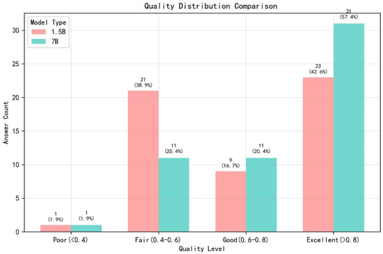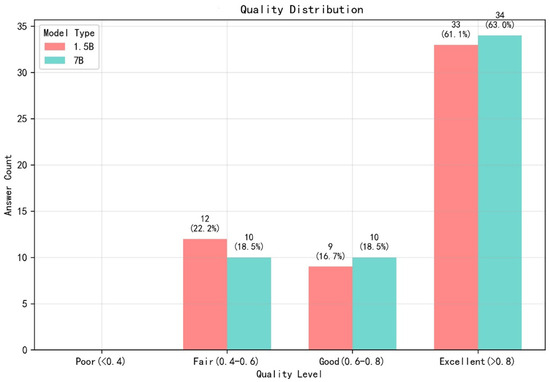 Based on the data analysis in Table 3, under conditions without RAG, the DeepSeek-R1-Distill-Qwen-1.5B and DeepSeek-R1-Distill-Qwen-7B models exhibit the expected scale effect characteristics. The DeepSeek-R1-Distill-Qwen-7B model demonstrates an extremely marginal advantage in the composite score, outperforming the DeepSeek-R1-Distill-Qwen-1.5B model by 1.07%. This indicates that increasing the number of parameters does indeed enhance foundational capabilities, though the improvement is relatively limited. Simultaneously, the two models show negligible differences across Faithfulness, Answer Relevancy, and Answer Semantic Similarity metrics. The sole marginal advantage lies in context precision, where the DeepSeek-R1-Distill-Qwen-7B model slightly outperforms the DeepSeek-R1-Distill-Qwen-1.5B model. Regarding average processing time, the DeepSeek-R1-Distill-Qwen-1.5B model completed tasks nearly six times faster than the DeepSeek-R1-Distill-Qwen-7B model. As shown in Figure 4, most responses from both models fall into the “high-quality” category. However, the DeepSeek-R1-Distill-Qwen-7B model produced a slightly higher proportion of high-quality and good answers while generating fewer average-quality responses, indicating superior stability in answer quality compared to the DeepSeek-R1-Distill-Qwen-1.5B model. Based on the above analysis, without RAG, the DeepSeek-R1-Distill-Qwen-7B model holds only a marginal advantage over the DeepSeek-R1-Distill-Qwen-1.5B model in response quality generation, yet requires significantly more processing time. In scenarios prioritizing efficiency where RAG technology cannot be applied, the DeepSeek-R1-Distill-Qwen-1.5B model demonstrates markedly superior performance compared to the DeepSeek-R1-Distill-Qwen-7B model.