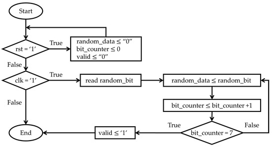 Figure 5 outlines the synchronous operation of the trng_8bit module within the new TRNG architecture. The module’s behavior is controlled by the signals rst (reset) and clk (clock), following the logical flow below: (I) Initialization (Reset): When the signal rst = ‘1’ (true), the module immediately reinitializes all registers. (II) Synchronous Sampling: When rst = ‘0’ (false), the logic waits for the rising edge of clk (clk = ‘1’). At this edge, the module performs the following functions: Reading the raw random_bit signal provided by the base TRNG module; assigning random_bit to the current position in the random_data (8-bit register), as indicated by bit_counter. (III) Counter and Valid Control: After storing the bit, bit_counter is incremented by 1. The logic then checks for byte completion: If bit_counter reaches 7 (meaning 8 bits have been collected), the valid signal is asserted (‘1’) to indicate that a random_byte is ready. Simultaneously, bit_counter is reset to 0 to begin collecting the next byte. Finally, random_byte is assigned to the value of random_data.