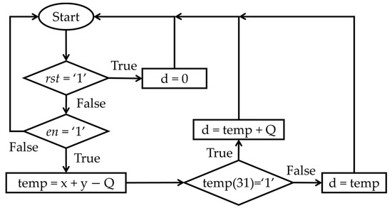 Finally, the modulo-q integer addition function, used for computing the public key h in the Falcon signature scheme, is implemented. Based on a deep understanding of the Falcon architecture, the hardware design of the mq_add block is inspired by reference [14]. The operation is mathematically described by Equation (6)