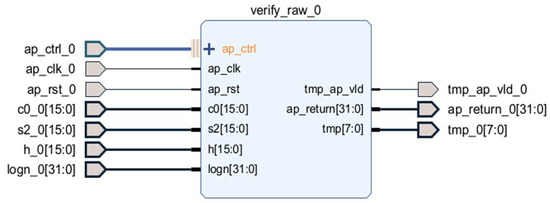 The verification block is designed based on the block diagram shown in Figure 11. The verify_raw function verifies a signature by performing a series of arithmetic operations on the values , , and h. First, it normalizes the elements of the array into the modulo-q range. Then, it computes in the NTT domain, followed by re-normalization. Finally, the function checks the length of the resulting vector to determine whether the signature is valid. The verify_raw function is generated from the original C code using HLS into a hardware IP core, as illustrated in Figure 12 and Figure 13. In this context, Figure 12 shows the verify_raw block with its input and output ports, while Figure 13 presents the RTL schematic design of the verify_raw block in detail.