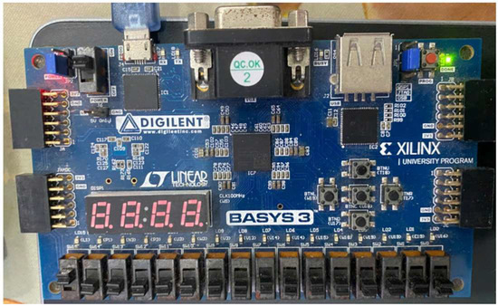 After completing the testing phase using simulation testbenches, the authors finalized the design and deployed it onto the hardware device. Figure 15 shows the detailed RTL synthesized circuit of the modules in the program based on the Falcon digital signature scheme, which will be loaded onto the hardware device using the XC7A35T-CPG236 chip. Figure 16 is a photograph of the device in operation, running the program modules that have been successfully loaded onto the hardware.