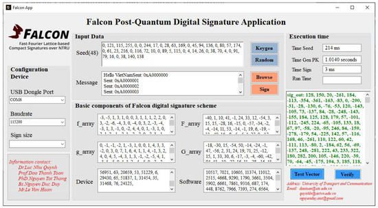 In the Falcon digital signature service system, the components of the functions used for generating the public–private key pairs and signing messages in the Falcon signature scheme are implemented in software by the authors. Specifically, for the signing operation, the process involves key expansion (expand_key) based on the input message combined with a nonce value (generated by the hardware), followed by message signing using the expanded falcon_tree (sign_tree) to produce the final signature. Since communication with the signing device is performed through a virtual COM port, the software interface includes a configuration section (such as port selection, baud rate, etc.) to match the hardware setup. The interface also provides operational buttons for each step of the signing scheme and displays the runtime for each function.