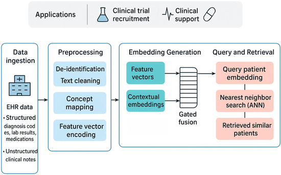 The remainder of this paper is organized as follows. Section 2 provides a review of the background and related work, covering the structure of EHR data, the evolution of medical embeddings, and the principles of scalable similarity search with ANNS algorithms. Section 3 details our proposed end-to-end framework, from data ingestion and preprocessing to the generation of multi-modal patient embeddings using a gated fusion mechanism and their subsequent indexing. Section 4 outlines the comprehensive experimental evaluation, including the datasets, cohort definitions, and performance metrics used. Moreover, Section 4 presents the results of our experiments, offering a comparative analysis of retrieval accuracy and framework’s performance. Section 5 discusses the clinical implications of our findings and explores real-world application scenarios, while also addressing the limitations of our study and directions for future work. Finally, Section 6 concludes the paper with a summary of our contributions and their transformative potential for precision medicine.