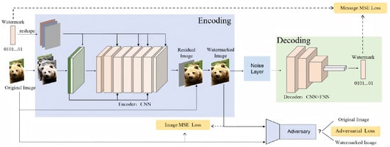 Overall framework of our scheme. The framework has four modules: (1) encoder, (2) decoder, (3) noise layer, and (4) adversary.