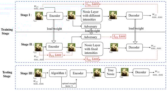 The scheme employed in our scheme comprises three steps: two training stages and a testing stage for adaptive control of watermarking performance through strength factor adjustment. During training, the method learns to generate residual images that are robust to various high-intensity distortions. At test time, a strength-balanced watermarking optimization algorithm is applied to adaptively produce high-quality watermarked images under diverse noise conditions. The entire process of model training and testing strategy is shown in Figure 3.