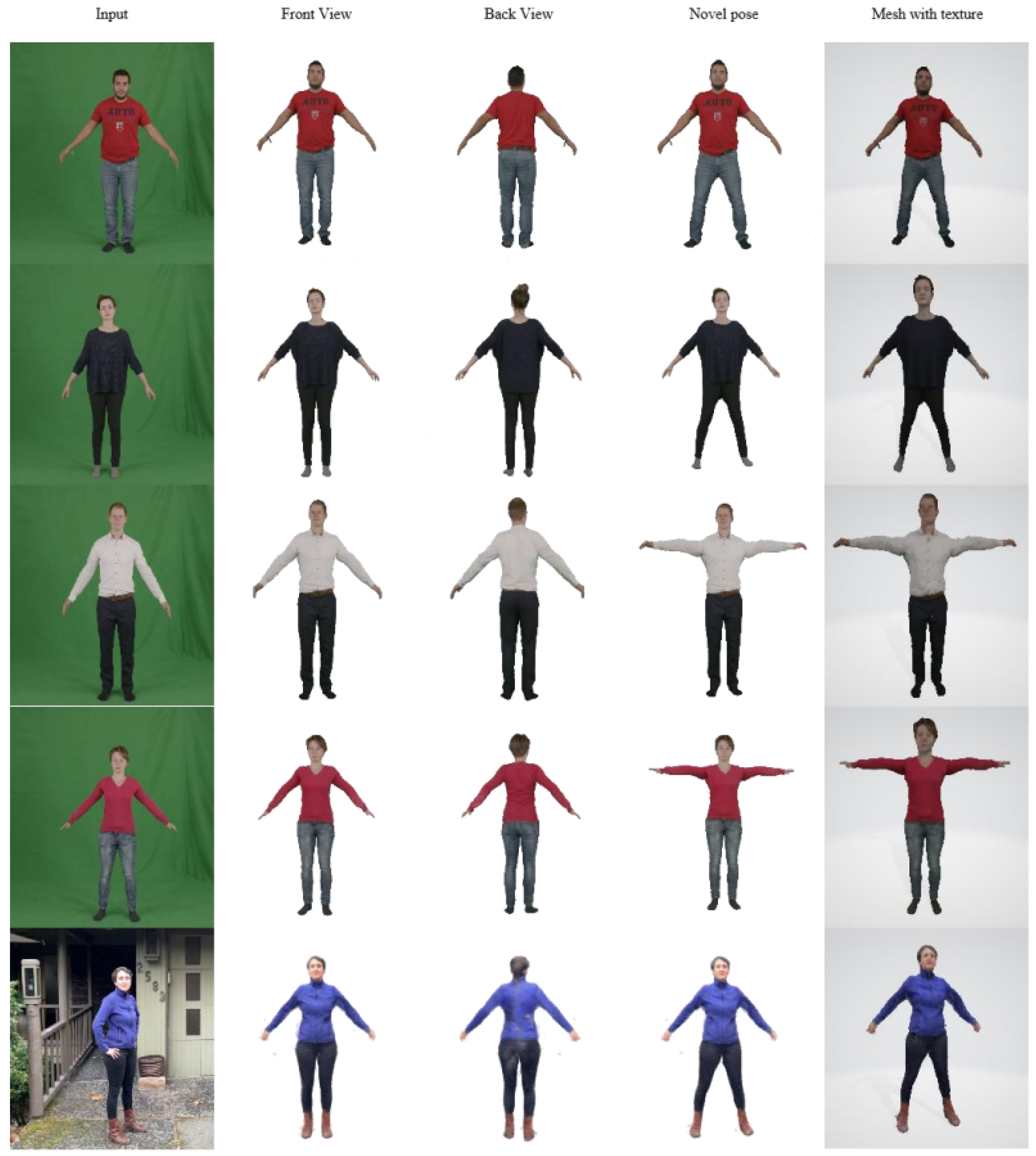 - Saito, S.; Huang, Z.; Natsume, R.; Morishima, S.; Kanazawa, A.; Li, H. Pifu: Pixel-aligned implicit function for high-resolution clothed human digitization. In Proceedings of the IEEE/CVF International Conference on Computer Vision, Seoul, Republic of Korea, 27 October–2 November 2019; pp. 2304–2314. [Google Scholar]