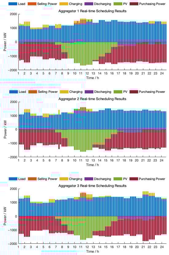 Consider three distributed PV–storage aggregators that operate independently while jointly participating in the energy market and frequency-regulation ancillary services. Each aggregator, aiming to maximize profit based on its day-ahead energy and FR capabilities, makes rational use of storage: the overall planning for participation in the energy market is shown in Figure 2, the day-ahead bidding strategies for the FR market are shown in Figure 3, and the corresponding day-ahead clearing results are shown in Figure 4. Based on day-ahead energy and FR requirements, the dispatching organization schedules each aggregator’s energy and FR provision across time periods to minimize total clearing costs. To ensure full utilization of storage, the state-of-charge trajectories of each aggregator are presented in Figure 5.