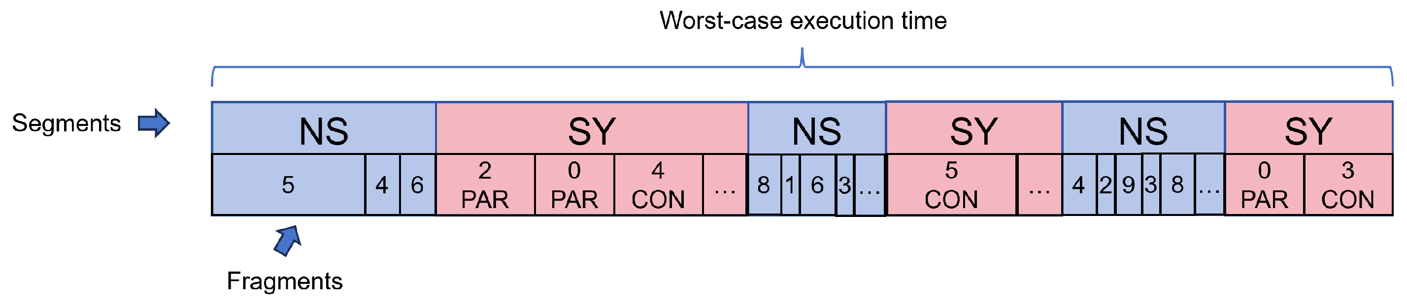 Building on the above contention model, we now integrate these factors into a formalized task-set model for multi-core evaluation. In real embedded systems, tasks typically consist of kernel API calls involving synchronization/communication, which explicitly introduce system-level contention, as well as conventional code, such as computation-intensive routines commonly found in control-flow programs. While the latter usually does not directly cause OS-level contention, it may still induce hardware-level contention through accessing to shared components like caches and memory buses. For clarity of modeling, we therefore abstract each task as a combination of NS (non-synchronization) segments and SY (synchronization) segments, where the NS ones represent typical computation workloads and the SY ones explicitly capture OS-level resource accesses.
