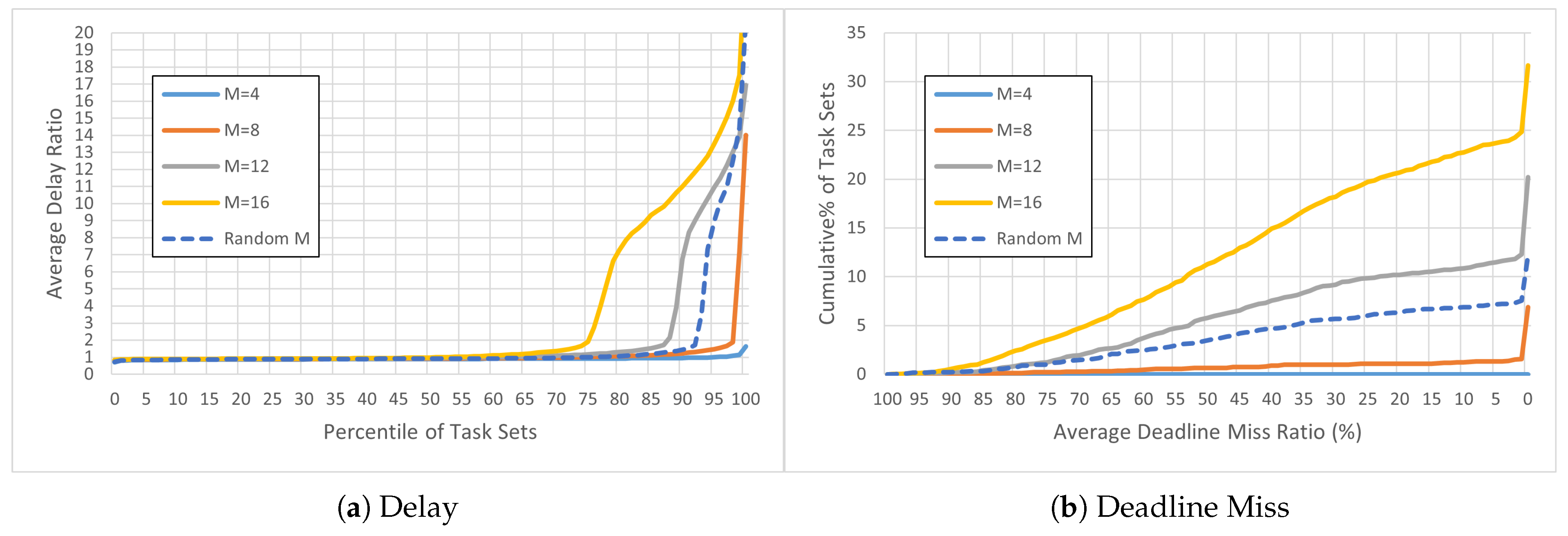 Mode 2: We evaluate task-set distributions under randomized conditions. In Mode 2a, 3000 task sets are generated for core counts of 4, 8, 12, and 16, allowing us to examine the distributions of delay ratios and deadline miss ratios under these configurations. In Mode 2b, 5000 task sets are generated with all variables randomized. Histograms are then used to characterize the distributions of delay ratios and deadline miss ratios in both cases.