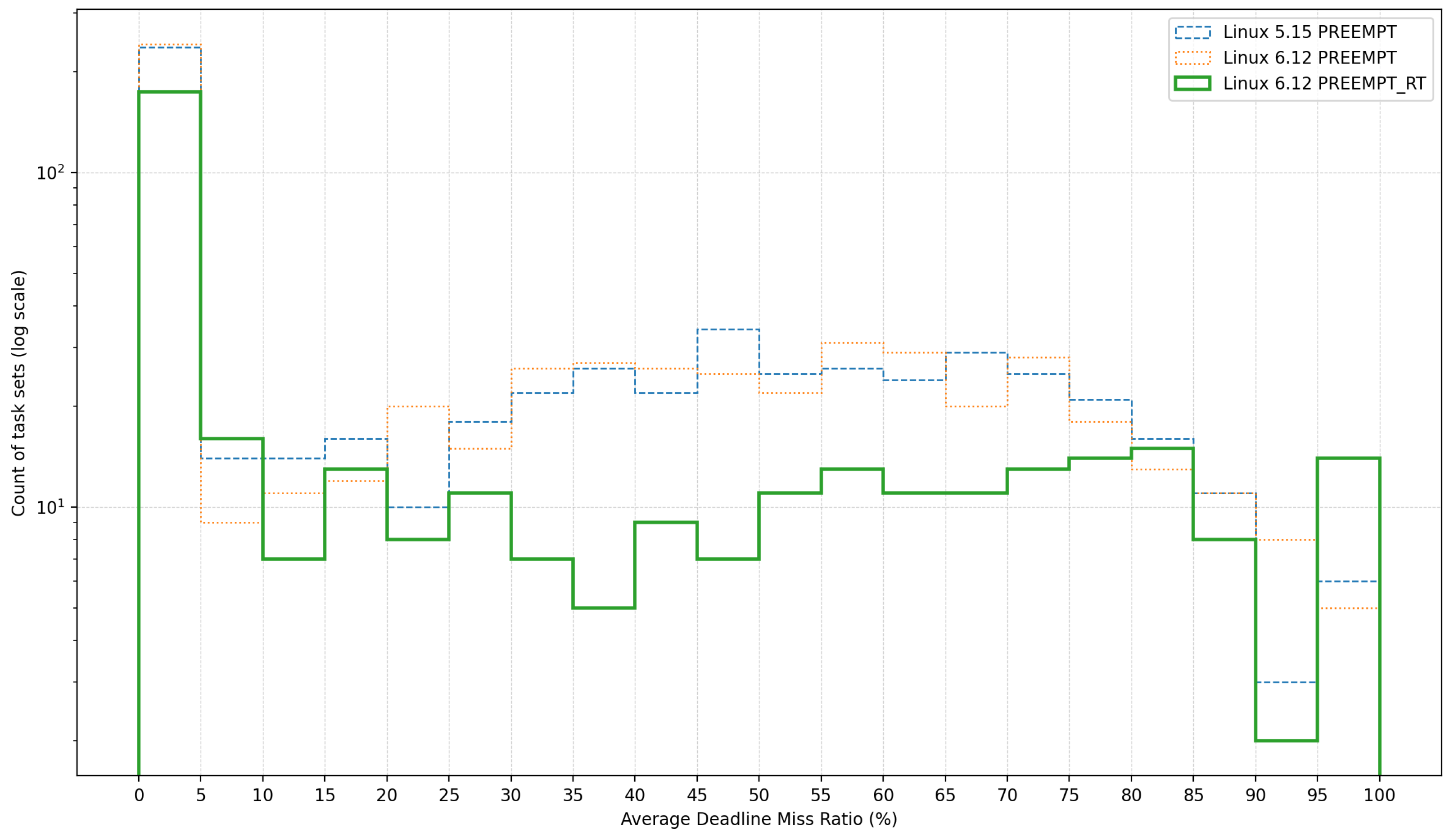Observation 9: PREEMPT_RT kernel effectively reduces overall deadline misses in most cases. Across the 5000 generated task sets, we observe that in the vast majority of cases, specifically for the ratio is below 95%, the chances of deadline miss are noticeably lower in PREEMPT_RT than the other two configurations. This provides further evidence of the superior performance of PREEMPT_RT under non-extreme conditions. However, in the extreme tail of the distribution where ratio exceeds 95%, PREEMPT_RT exhibits a higher frequency of deadline misses. This finding aligns with the earlier observations, indicating that under saturated contention the intrinsic overhead of real-time patches may dominate, leading to increased delays.