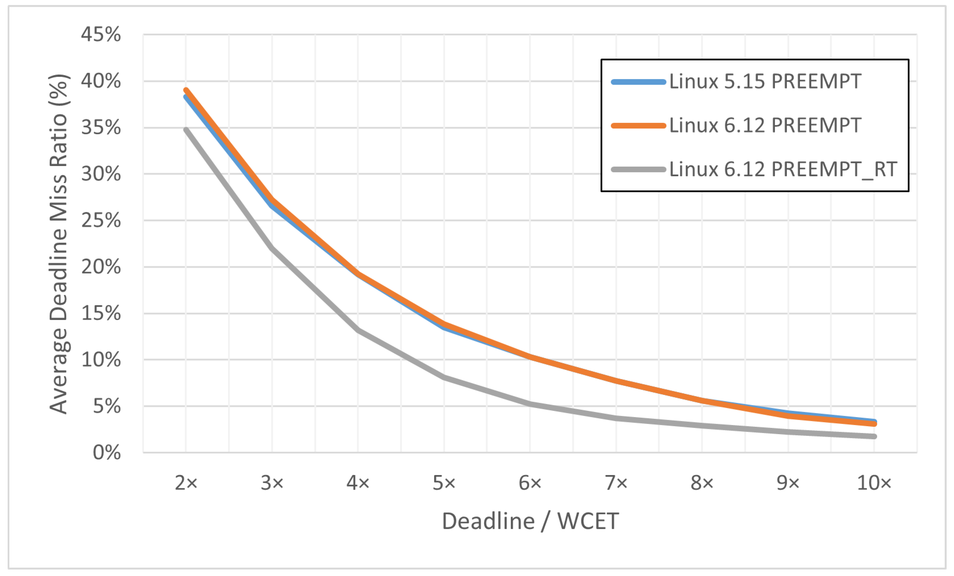 Figure 10, all configurations show significant increase in deadline miss ratio as the utilization level gains. When the deadline parameter is 2× WCET (i.e., 50% utilization), even PREEMPT_RT will miss 35% deadline of all jobs. It indicates that, at least on our 16-core environment, current Linux is difficult to achieve reasonable performance for real-time systems if all cores have tasks with relatively tight deadline requirement. Meanwhile, under the 10× deadline parameter setting, all three configurations show less than 4% miss rate, which should be considered acceptable for many soft real-time use cases. Therefore, we believe 10× should be a good default value to generate useful task sets for evaluating systems with a large number of cores.