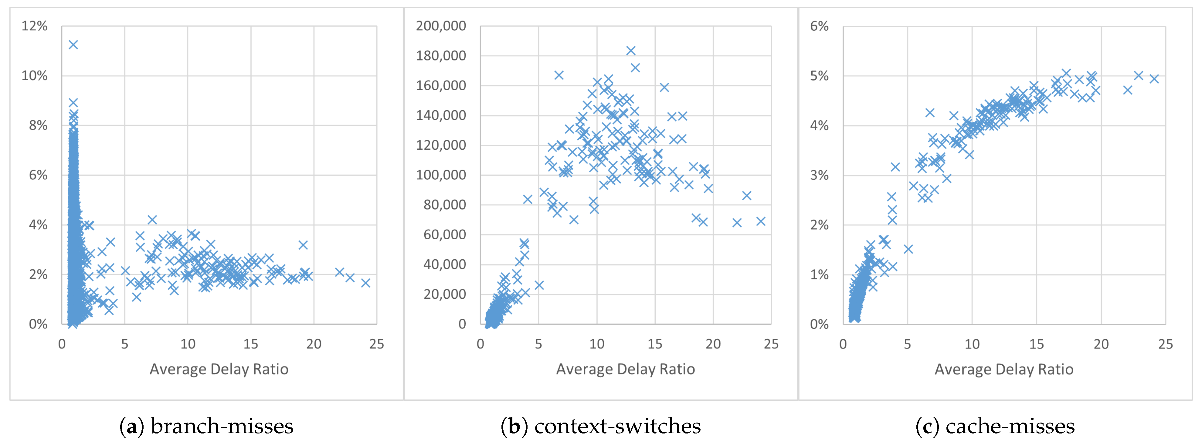 Figure 11 plots three events (branch-misses, context-switches and cache-misses), each showing a different correlation pattern to the delay ratio. The results indicate that the branch-misses events have almost no impact on performance, while the cache-misses events show a clear logarithmic-like correlation. As for the context-switches events, they can introduce a medium amount of delay but are less relevant to those task sets with very high delay. This experiment confirms that our benchmark tool can easily cooperate with existing profilers to analyze the factors causing performance bottlenecks.