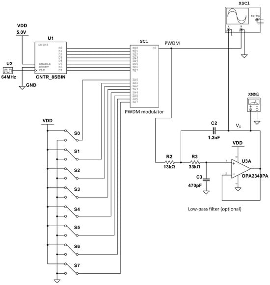 The paper is organized as follows: Section 2 presents the new PWDM and explains how it can be used as a digital-to-analog (DA) converter; Section 3 describes the experimental tests conducted to validate the circuit; Section 4 discusses the results obtained; and Section 5 summarizes the main conclusions of the work.