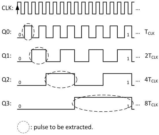The extraction can be done by a simple logic circuit. For example, the narrower pulse, corresponding to the LSB, shall be collected if the input bit is true AND the output of the binary counter is . This leads to the top AND block shown in Figure 6, where the signal pulses with a width of if (where is the clock period of the binary counter). The same applies to the remaining bits: