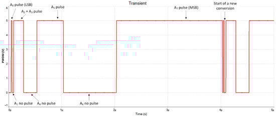 The digital code = 1010 1101 was applied to the input of the PWDM to validate its functionality. This specific sequence was chosen because it generates a wide variety of pulses, allowing for a comprehensive assessment of the modulator’s performance. Figure 9 displays the corresponding output signal. Each 1-bit contributes to an increase in the output’s duty cycle, commencing with the LSB that generates the narrowest pulse and culminating with the MSB responsible for the widest pulse. The signal’s amplitude spans the full rail-to-rail range, from 0 V to 5 V. A complete conversion cycle is executed within 4 µs, as expected. It is important to note that duty cycle never reaches 100% because the PWM line goes down during one clock period when the binary counter returns to zero.