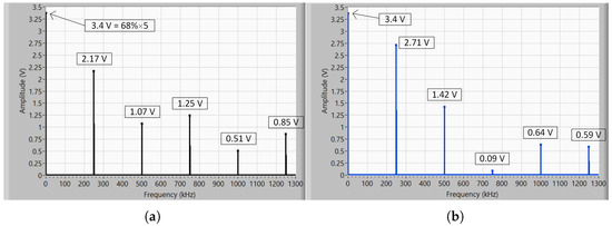 Spectrum comparison between PWDM and PWM signals: (a) Amplitude spectrum of the PWDM signal shown in Figure 9. (b) Amplitude spectrum of an “equivalent” PWM signal. The spectra were calculated over 400 µs, equivalent to 100 sampling periods, containing a total of 100 k samples acquired with a step size equal to 4 ns. The PWDM signal was generated by the circuit of Figure 4 and the “equivalent” PWM signal was generated by a modulator similar to that of Figure 2a. Both signals were exported to LabVIEW where their spectra were computed with rectangular windowing.