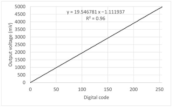 Table 1 presents the output voltage () obtained for a selection of binary input combinations, specifically encompassing the minimum (all zeros), maximum (all ones), and power-of-two codes. The graphical representation of the static transfer characteristic is illustrated in Figure 12, with the abscissa representing the input digital code (expressed as an integer value) and the ordinate representing the corresponding mean output voltage. The observed characteristic exhibits a high degree of linear correlation with a fitted straight line characterized by a slope of 19.547 mV/LSB and an offset of 1.1119 mV. According to [19], these values are the independently based gain and offset of the DA converter, respectively.