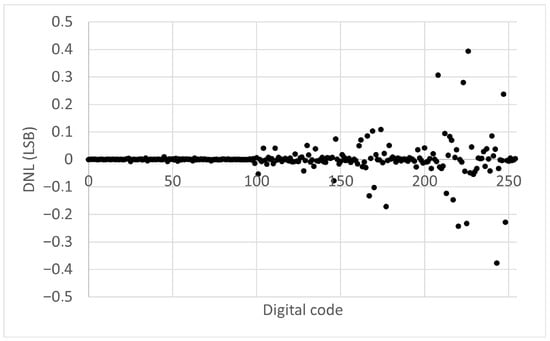 The output voltage measurements obtained during the static characterization were applied to Equation (4), leading to the data shown in Figure 13. It is clear that the DNL remains below 1 LSB, thereby confirming the absence of missing codes in the converter’s transfer characteristic. Some performance degradation is also observed for larger digital codes, which is understandable because any deviations in pulse width have a greater impact on the output voltage. Such deviations can be caused by the cumulative effect of minor timing jitters arising from the propagation delay of logic gates.