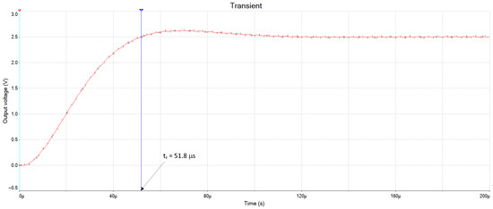 The circuit was simulated in transient mode to see its step response and study its dynamic properties. All simulation parameters were set to the default values except for the stop time, which was set to 200 µs in order to give enough time for the circuit to stabilize.
