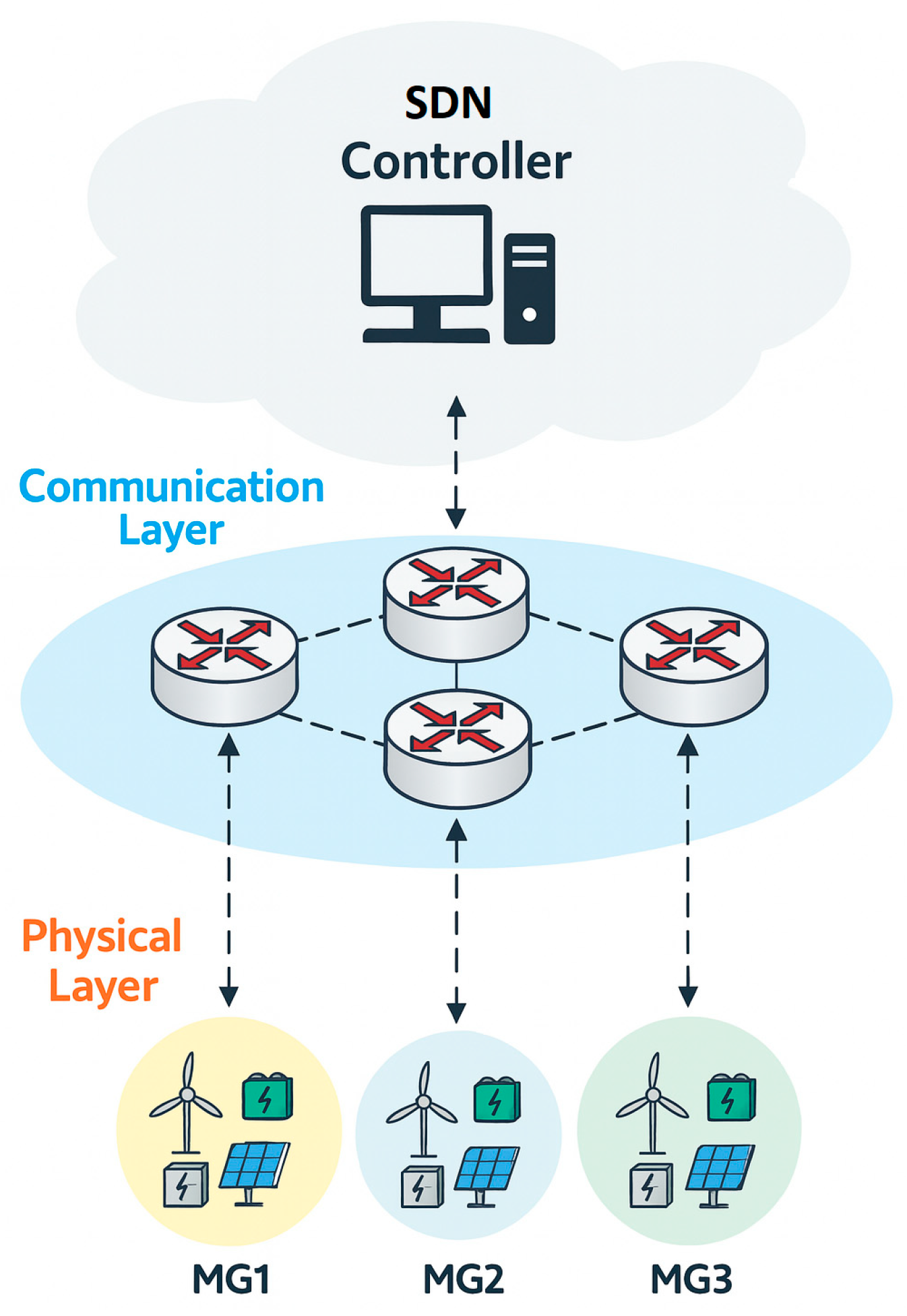 This section focuses on the cyber layer of multi-microgrids, specifically the implementation of SDN for communication and control. The first subsection introduces the concept of SDN, highlighting its key differences from traditional networking architectures, particularly its separation of control and data planes, centralized decision-making, and programmability. These features make SDN well-suited for dynamic, distributed energy systems, such as microgrids. The second subsection presents the integration of SDN within the proposed multi-microgrid system, detailing how communication between DG units, ESS, and loads is managed through an SDN controller. This setup enables real-time monitoring, flexible reconfiguration, and coordinated control actions, enhancing the system’s responsiveness and resilience.