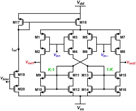 MOSFETs , , and form the SCCM in one part of the symmetric circuit. For a scaling factor of K:1, the relation between the and is given by Equation (4).