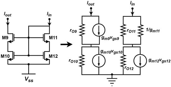 According to [30,46], the self-cascode current mirror (SCCM) for the load pair can be designed with a lower than a conventional current mirror, allowing for low voltage operation and large output swings with a smaller area. The SCCM’s substantial output resistance improves the common-mode rejection ratio and makes it a better current mirror. Figure 4 shows the small-signal model of the SCCM.