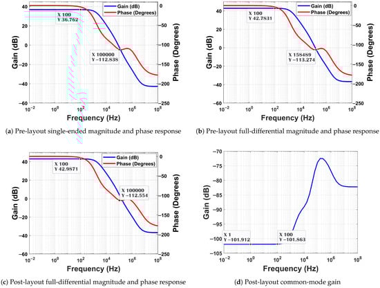 Figure 9 illustrates the frequency response of the OTA. Figure 9a,b illustrates the pre-layout magnitude responses for single-ended and full differential inputs. The single-ended version maintains a 36.76 dB gain with 67.2° phase margin, while the differential one has 42.78 dB gain with 66.3° phase. The later one demonstrates a higher unity gain bandwidth () of 158 kHz, whereas the previous one has a lower of 100 kHz only. It is due to the differential action () which gives out a higher gain. The layout edition of differential input shown in Figure 9c demonstrates a similar gain, while the is 100 kHz. The parasitics from the layout are responsible for reducing it. The obtained gains can amplify a signal of 10 V to 689 V–1.41 mV.